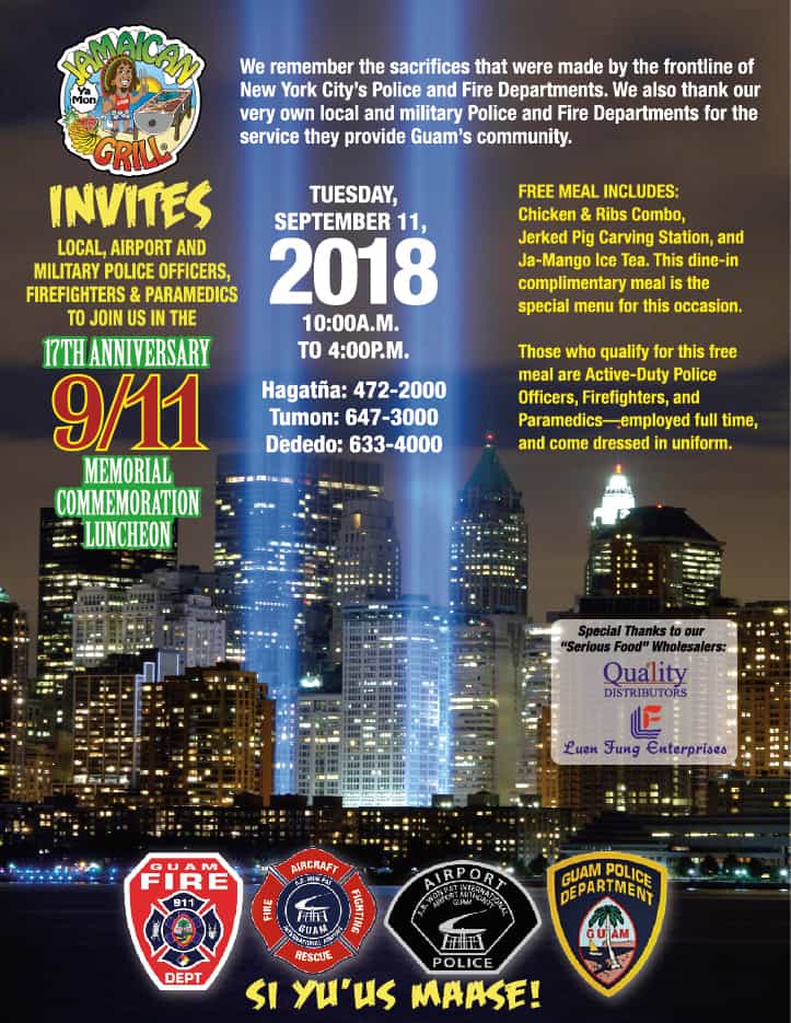 Thank you to Jamaican Grill for honoring our first responders by offering a Free Meal on Tuesday, September 11, 2018 from 10am to 4pm in all three locations (Hagatna, Tumon, Dededo).