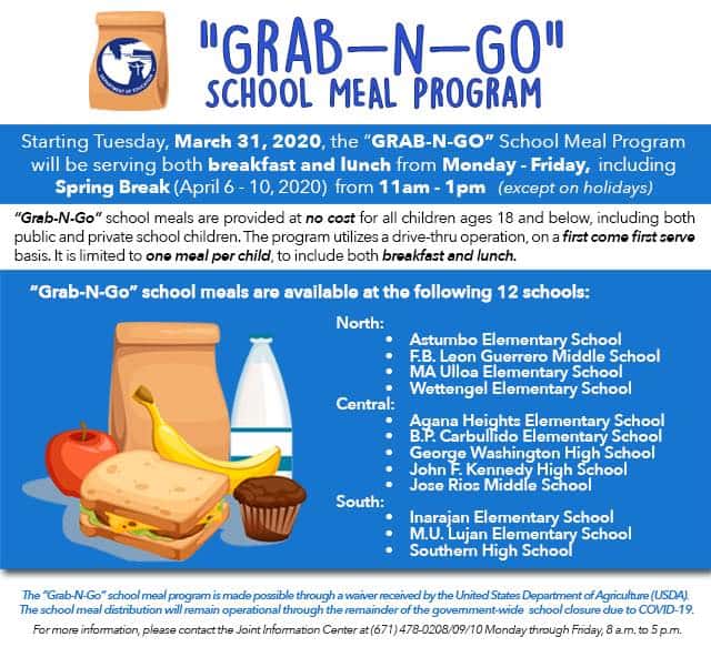 Beginning, Tuesday, March 31, the Guam Department of Education will expand its Grab-N-Go meal program. In addition to serving lunch, breakfast will also be available at no cost. Maria Ulloa Elementary has also been added as a meal distribution site. The meals will also be provided during spring break (April 6-10).