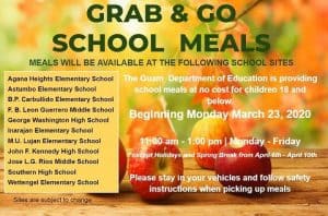 GDOE recognizes that some households look forward to the free breakfast and lunch meal program offered by GDOE. Beginning Monday, March 23, GDOE will be providing Grab-N-Go lunches to children at one of 11 designated schools throughout the island from 11am to 1pm.